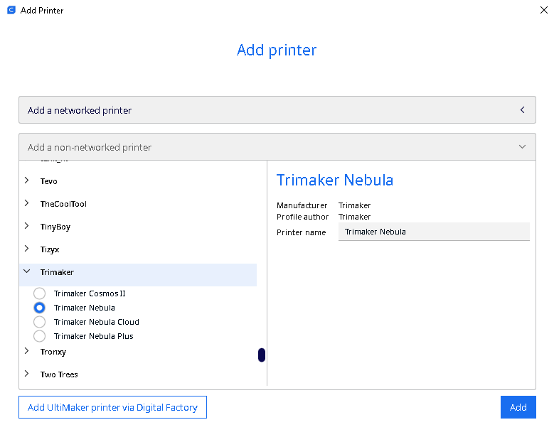 Se abrirá la siguiente ventana, donde seleccionamos "add a non UltimMaker printer" Buscamos Trimaker entre la lista de fabricantes, seleccionamos la Trimaker Nébula y presionamos "add"